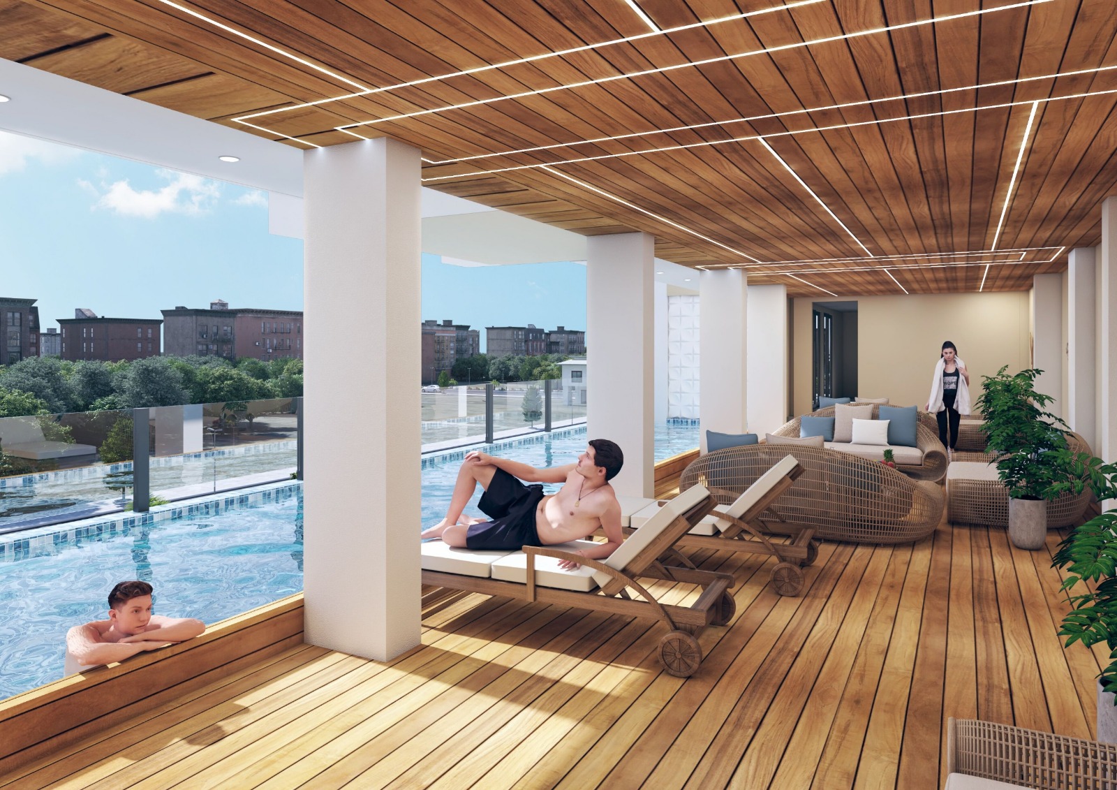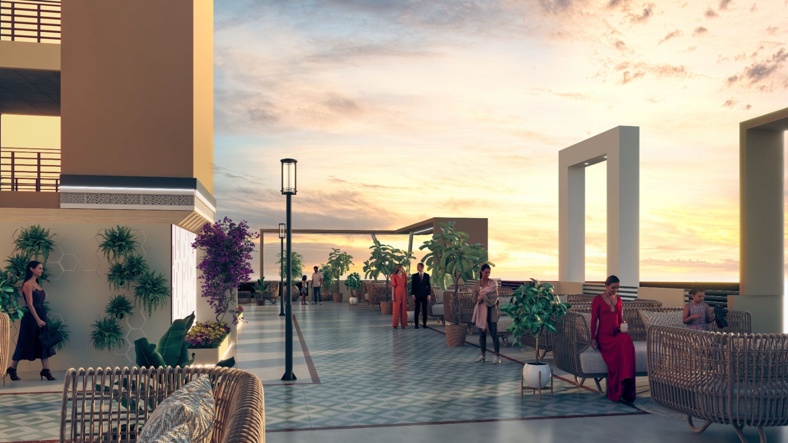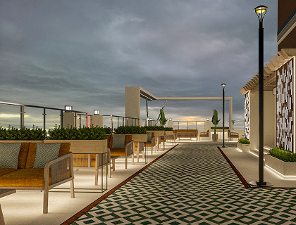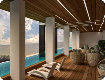 Infinity lap pool with deck, high-end gym, multipurpose hall, indoor games, and exclusive sky terrace with LED panel.